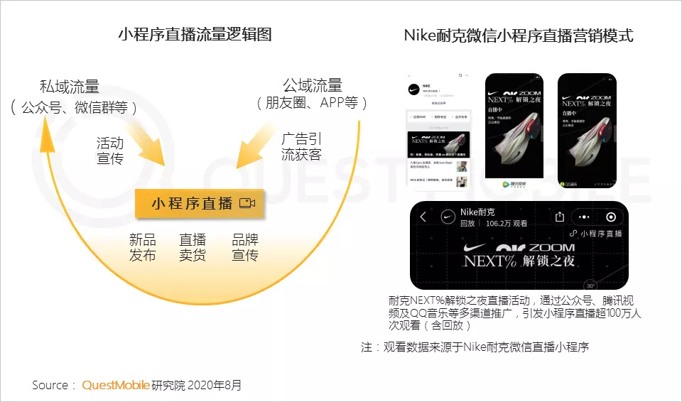 4.2 小程序直播具备公域流量转化形成私域商业闭环的优势,成为线下品牌店开拓线上业务的新渠道;耐克通过小程序直播进行新品发布及售卖,视频、音乐等多渠道引流契合用户兴趣属性偏好