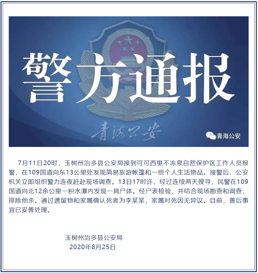 据青海玉树州治多县公安局通报,7月11日20时,玉树州治多县公安局接到可可西里不冻泉自然保护区工作人员报警,在109国道向东13公里处发现简易旅游帐篷和一些个人生活物品。接警后,公安机关立即组织警力连夜赶赴现场调查。13日17时许,经过连续两天搜寻,民警在109国道向北12余公里一积水潭内发现一具尸体。经尸表检验,并结合现场勘查和调查,排除他杀。通过遗留物和家属确认死者为李某某,家属对死因无异议。目前,善后事宜已妥善处理。