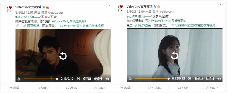 虽然微博所发物料以单人为主,但是在各自的影片中,有着互相向对方发短信的镜头,给了大家想象和留白的空间。在这样的隔空互动中,Valentino先后发布6支杨紫和杨洋的相关影片,播放量达到了466万。