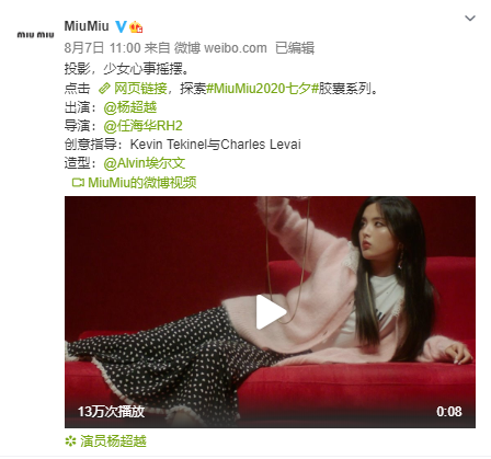 从2018年开始,MIUMIU就与杨超越一直保持着友好合作关系,并多次邀请她出席时装周。今年七夕,MIUMIU也只选择了杨超越一人做大力宣传,从8月5日开始,接连发布8条杨超越相关微博,包括个人海报及情景视频,以“少女心事”为主题宣传#MiuMiu2020七夕#胶囊系列,微博总互动声量达到了100万+。