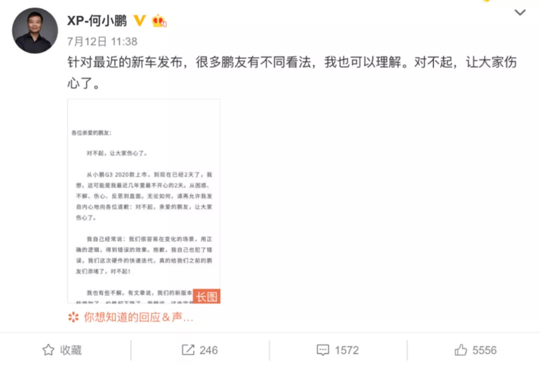此后,何小鹏在微博向客户道歉:“对不起,让大家伤心了。”并提出补偿方案:所有G3 2019款个人车主3年之内增换小鹏汽车任何一款车型时,在所有促销权益的基础上,额外享受10000元补贴。