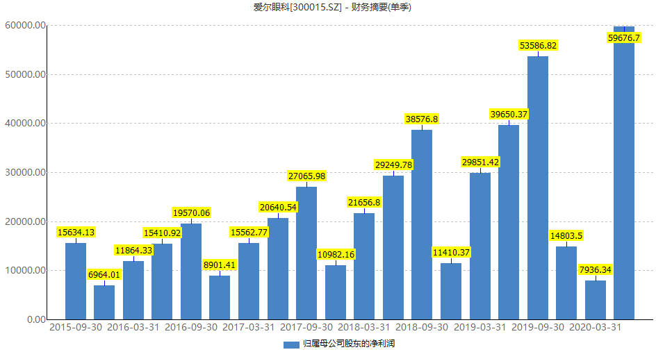 爱尔眼科单季业绩周期波动明显,从每年四季度到次年一、二、三季度呈阶梯式递增。疫情打乱了公司2020年的节奏,爱尔眼科第一季度净利润大降超过70%。