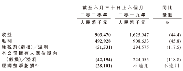 8月24日晚,周黑鸭发布2020年上半年财务报告。报告显示,周黑鸭上半年营收9.03亿元,同比减少44.4%;毛利4.93亿元,同比减少45.8%;公司拥有人应占亏损4219.4万元,同比下降118.8%;期间经调整亏损2810.1万元,每股亏损0.02元。