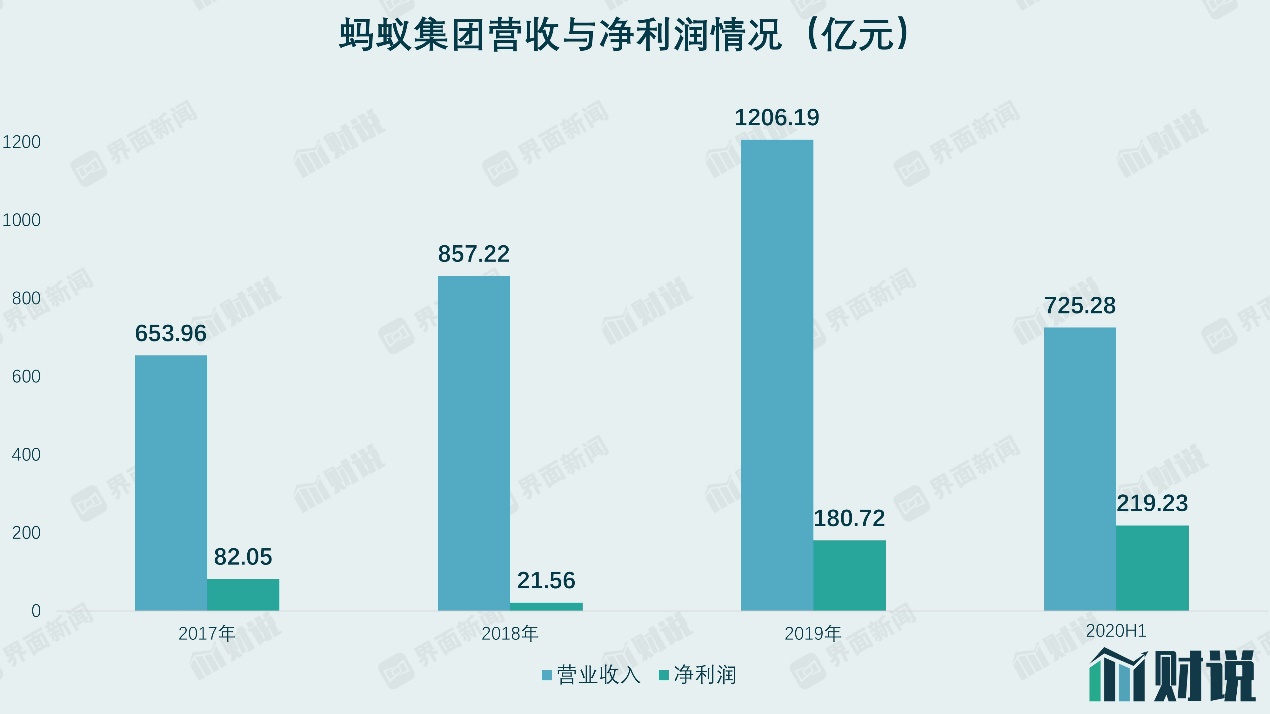 招股书显示,2017年度、2018年度、2019年度和2020年1-6月,蚂蚁集团分别实现营业收入653.96亿元、857.22亿元、1206.18亿元和725.28亿元,2017年度至2019年度年均复合增长率为35.81%;分别实现净利润82.05亿元、21.56亿元、180.72亿元和219.23亿元。