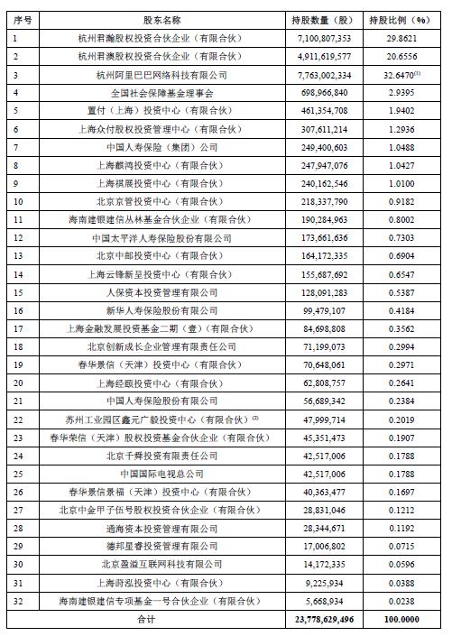 蚂蚁集团目前有32名股东。如果进一步穿透,据不完全统计,参股蚂蚁集团的A股上市公司共有14家。