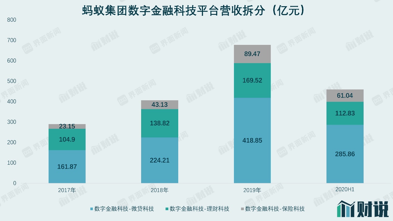 蚂蚁集团第二块业务是数字金融科技平台。数据显示,该业务2019年营收规模为677.84亿元,比例约56.2%。2020上半年,该业务营收达到459.72亿元,占比升至63.4%。