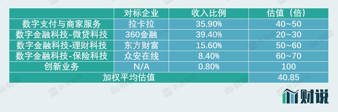 采用分部估值法,将支付业务(即数字支付与商家服务)、微贷科技业务、理财科技业务以及保险科技业务四部分分别找寻市场上合适标的进行对标,最终得到的加权平均估值约为40.85倍。按照最近12个月合计净利润为381亿元计算,乘以40倍的市盈率计算,预计蚂蚁集团的总市值将达1.52万亿。