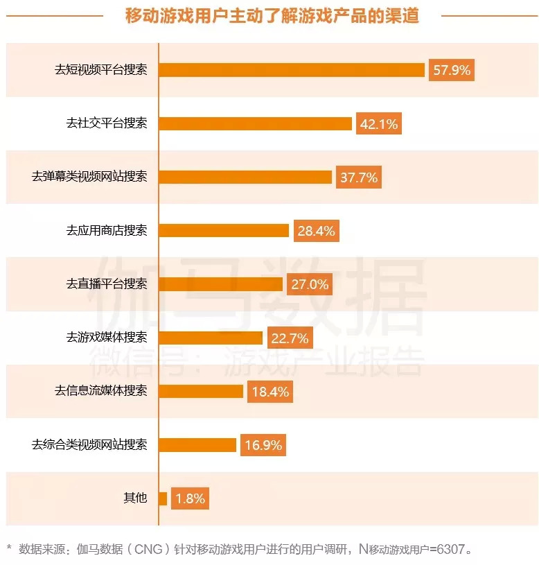 与此同时,短视频成为游戏周边内容生态最为重要的构成部分。根据伽马数据统计,57.9%的移动游戏用户会把自己主动了解游戏产品的渠道放在短视频平台,甚至超过了社交媒体、弹幕视频等渠道。而传统游戏直播平台仅仅占到了27%,只有短视频平台的一半。