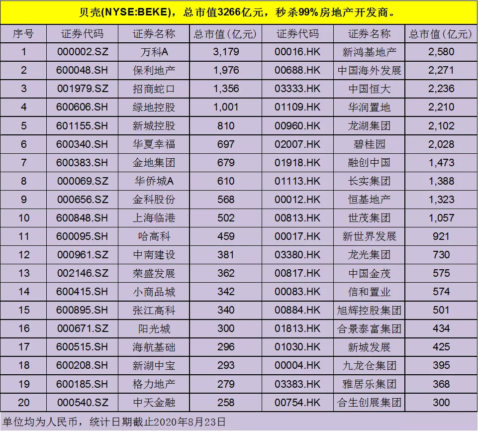 截止2020年8月23日,贝壳市值472亿美元,折合人民币3266亿元;房地产开发商常青树大哥万科A(SZ:000002)市值3179亿元。其它的老牌房地产开发商: