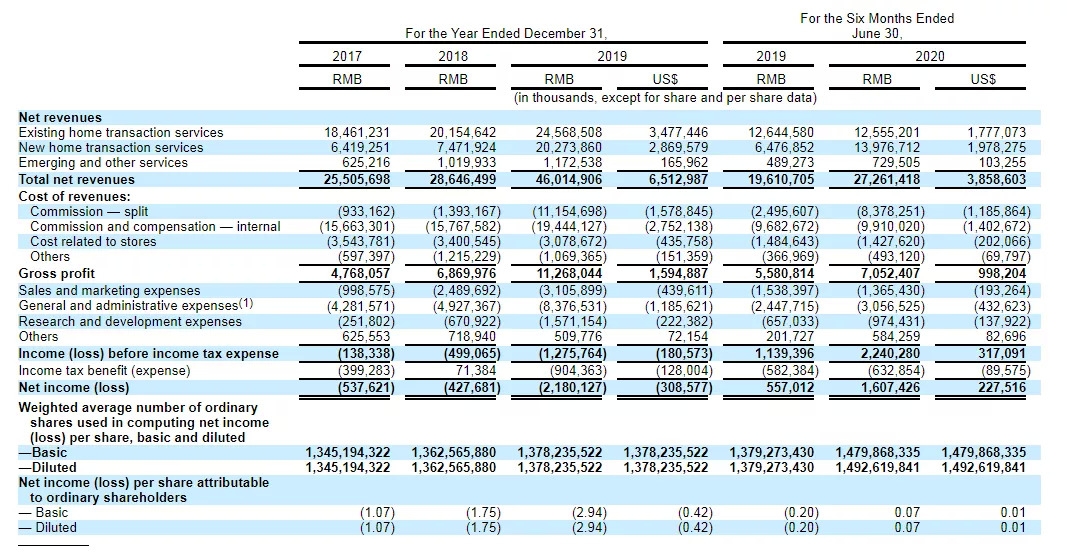 ◆2020年H1,贝壳收入为272.6亿元,同比增长39%。收入来源主要是撮合二手房和一手房的交易。净利润为16.1亿元,同比增长189%。
