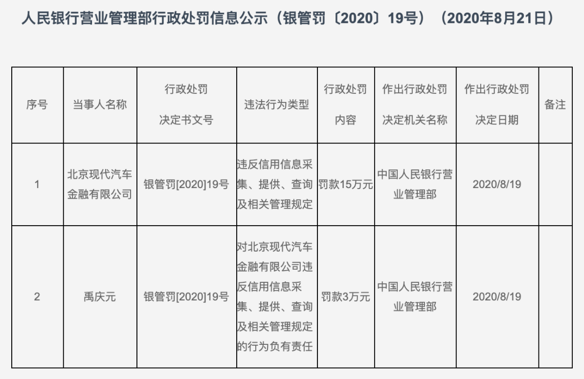 日前,北京现代汽车金融有限公司因违反信用信息采集、提供、查询及相关管理规定,被央行营业管理部罚款15万元,作出行政处罚决定日期为8月19日。