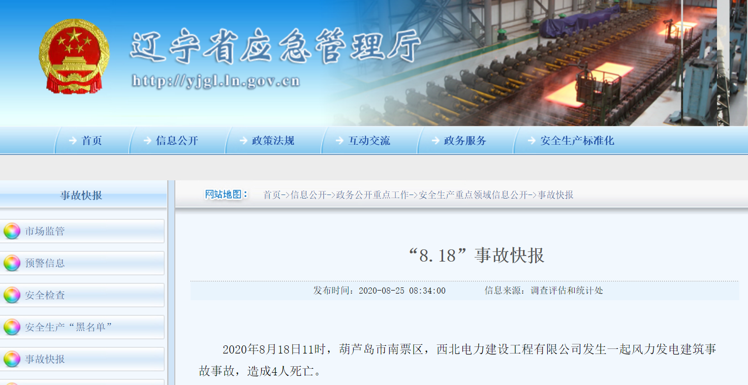 辽宁省应急管理厅网站消息,2020年8月18日11时,葫芦岛市南票区,西北电力建设工程有限公司发生一起风力发电建筑事故,造成4人死亡。