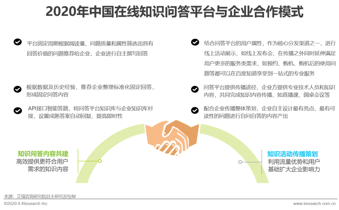 在线问答平台作为连接企业与用户的桥梁,通过知识问答内容共建和知识活动传播策划两种方式。一方面既可以通过和企业的无缝衔接,高效、专业、及时的解答用户的各项问题,满足用户问答需求;另一方面,通过与企业方合作共建知识内容,增加企业方曝光的机会,也在问答互动中增强用户对品牌的认可,用深度内容承载品牌高价值信息,解决了营销内容同质化的问题。