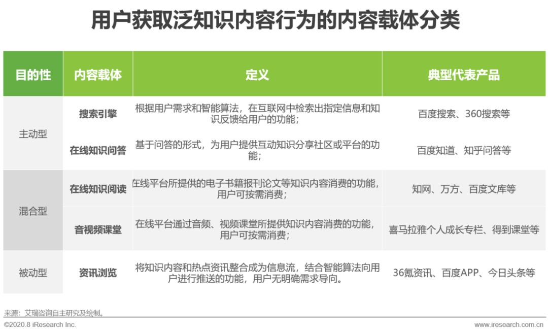 中国在线泛知识内容行业以功能为载体,根据用户获取知识和信息行为的目的性强弱可划分为:主动型、被动型以及混合型三大类别。