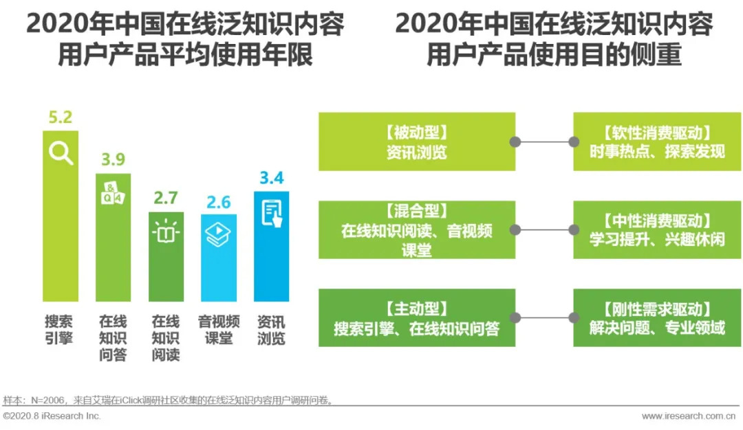 其中,主动型包含搜索引擎和在线知识问答两类,用户根据自身需要主动寻求知识内容进行答疑解惑,知识内容多呈现碎片化特征,更能高效满足用户特定化的需求;混合型包含在线知识阅读和音视频课堂类,用户根据自身需要在平台所提供的知识内容中进行选择性消费,此类知识内容多具有体系化的特征;最后,被动型主要以资讯浏览为主,平台基于一定的智能算法对用户进行实时的知识信息内容推荐,亦有碎片化的特征。