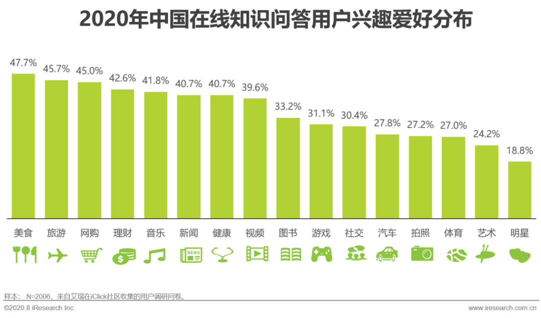 从兴趣爱好分布来看,在线知识问答用户爱好广泛,最喜欢美食(47.7%)、旅游(45.7%)、网购(45.0%)这三种文化娱乐方式。相较于其他用户,在线知识问答用户更注重精神生活的享受,例如对美食、旅游、音乐等爱好的热衷;此外,由于用户群普遍年轻且学历较高,更注重科普资讯类爱好的培养,如理财、新闻、健康、视频等。而在这些兴趣爱好中,在线知识问答在美食做法、旅游攻略、理财指导、新闻解读、健康科普等使用场景中的应用也满足了用户相应的需求。