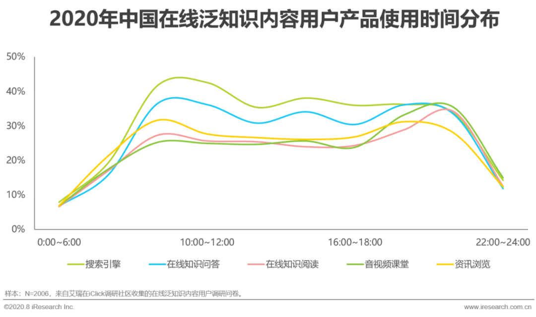 根据调研数据的结果显示,在不同种类获取知识行为所对应的产品中,搜索引擎与在线知识问答具有明显更高的用户渗透率,使用占比均超过80%。而从使用时间分布来看,这两类功能的使用率在上午和下午时段达到峰值,可被视为是用户在日常的工作和学习过程中获取在线知识内容的常规途径和工具,值得一提的是,在线知识问答在夜间亦具有一次峰值,因此同时可被视为是用户闲暇娱乐时的一种内容消费途径;而在线知识阅读和音视频课堂作为知识内容更加体系化的两种类型,同样是在夜间具有更高的使用率。