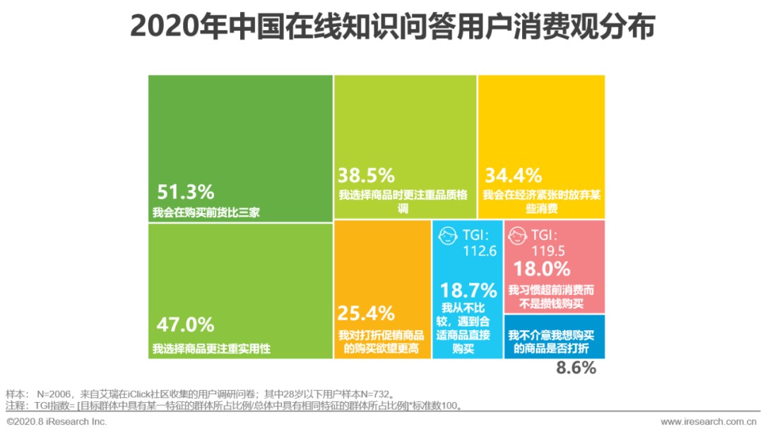 在消费观方面,在线知识问答用户整体更偏向保守、谨慎的风格,超过半数的用户表示会在购买前货比三家,47%的用户表示会更加注重商品的实用性。而通过交叉分析可以发现,28岁及以下的年轻用户则有更大比例在购物时表现“爽快”,具体表现为不比较商品而是直接购买,以及习惯超前消费。另外,在具体购买的商品类别方面,在线知识问答用户所购买的商品多具备实用性的特征,而尤其值得注意的是,超过半数的用户表示过去一年购买过金融理财类产品,这表示在线知识问答用户更具备理财头脑、更看产品重内在价值。