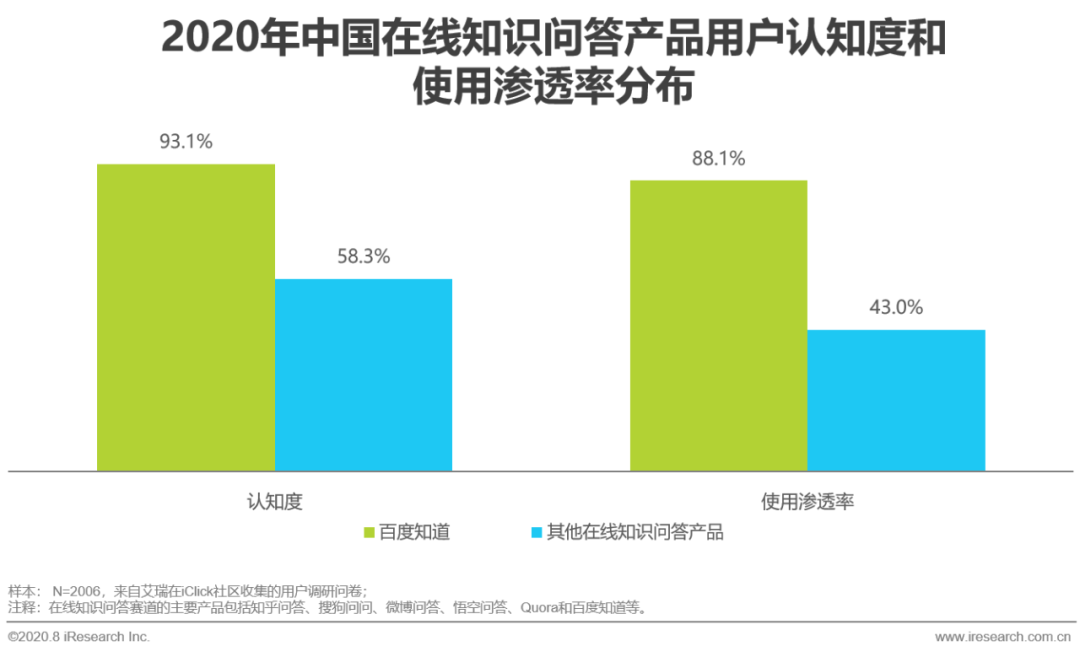 在线知识问答用户对百度知道的认知度和渗透率更高
