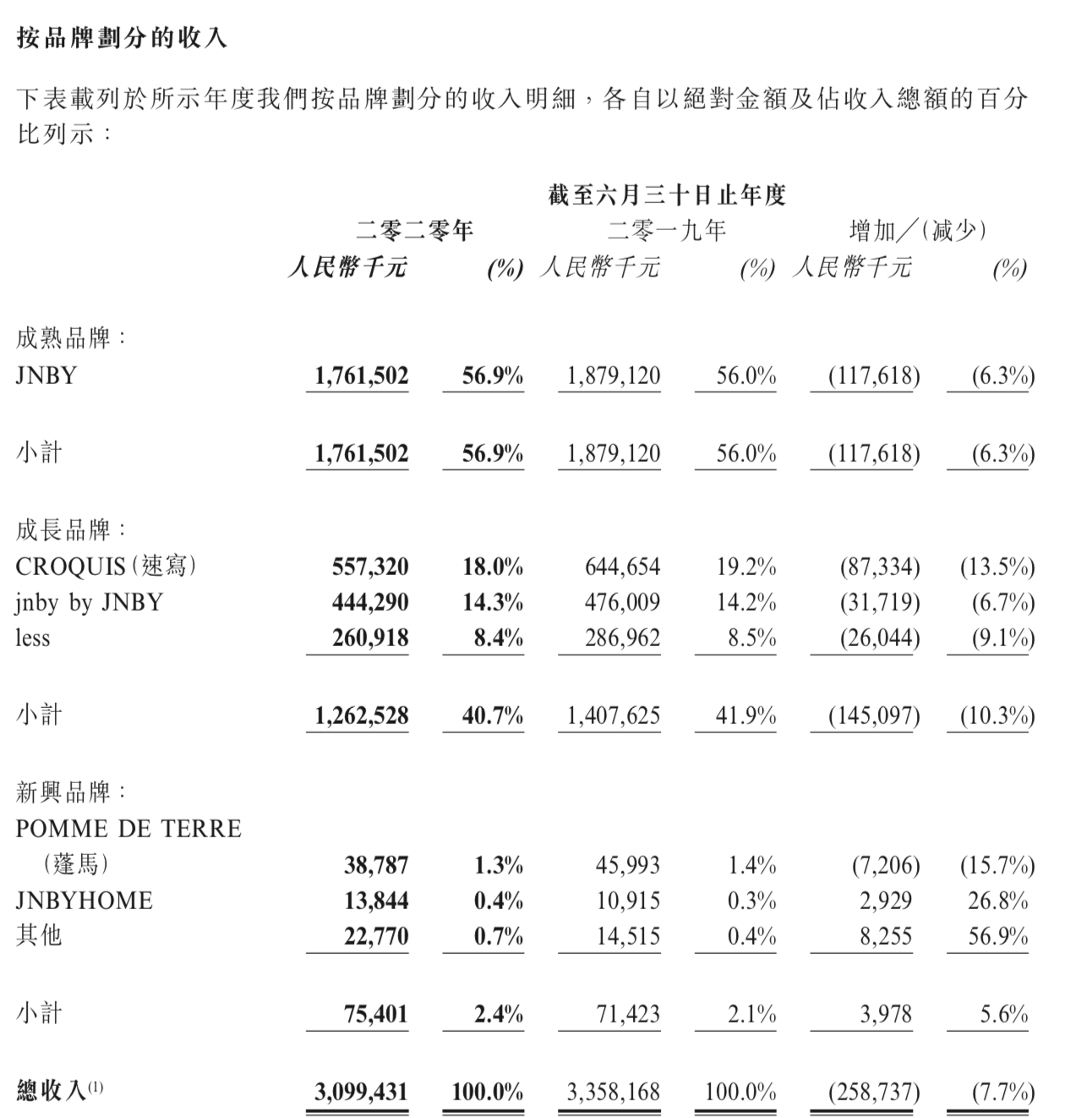 该集团将旗下品牌按照发展阶段划分并分别核算业绩表现情况,期内成熟品牌JNBY,以及包括CROQUIS速写、童装jnby by JNBY和less在内的成长品牌部分的营收都同比有所下滑。POMME DE TERRE蓬馬和家居品牌JNBYHOME所在的新兴品牌部门虽然销售额同比有增长,但仍然是亏损状态。