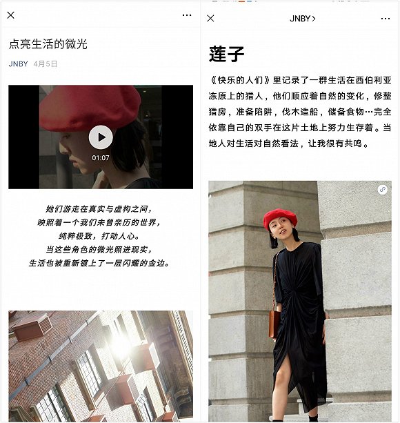 该集团主品牌JNBY从2015年便开始经营微信公众号,集团内部也成立了信息中心。JNBY擅长用“讲故事”式的内容营销方式传达品牌调性,这让它自然地跳出卖衣服的框架,获取了许多价值观和审美观相同的粉丝。更长远来看,这种高匹配度的粉丝更有可能长久地忠实于品牌,这也是JNBY的会员一直能提供较高业绩占比的原因所在。