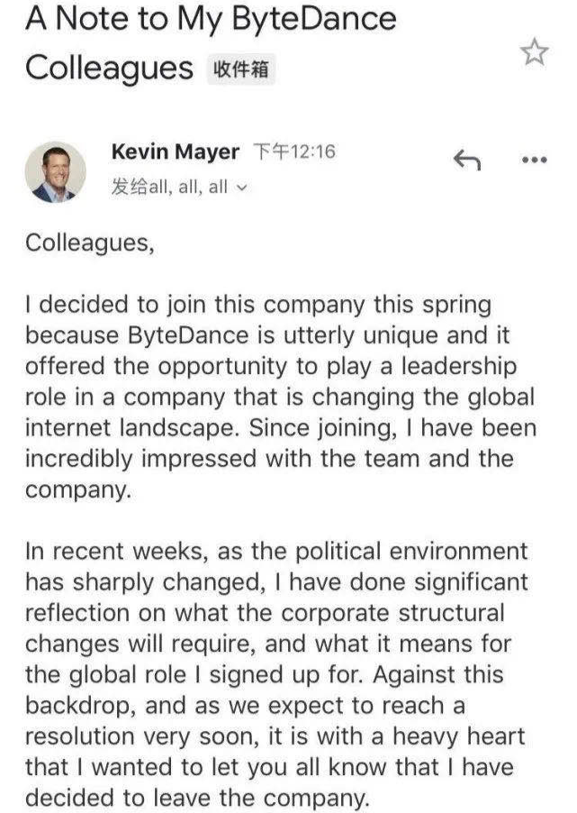 字节跳动创始人在之前的一封公开信中要求员工“走出舒适区,拥抱变化”,但大概他也没想到最先拥抱变化的竟是凯文·梅耶尔。
