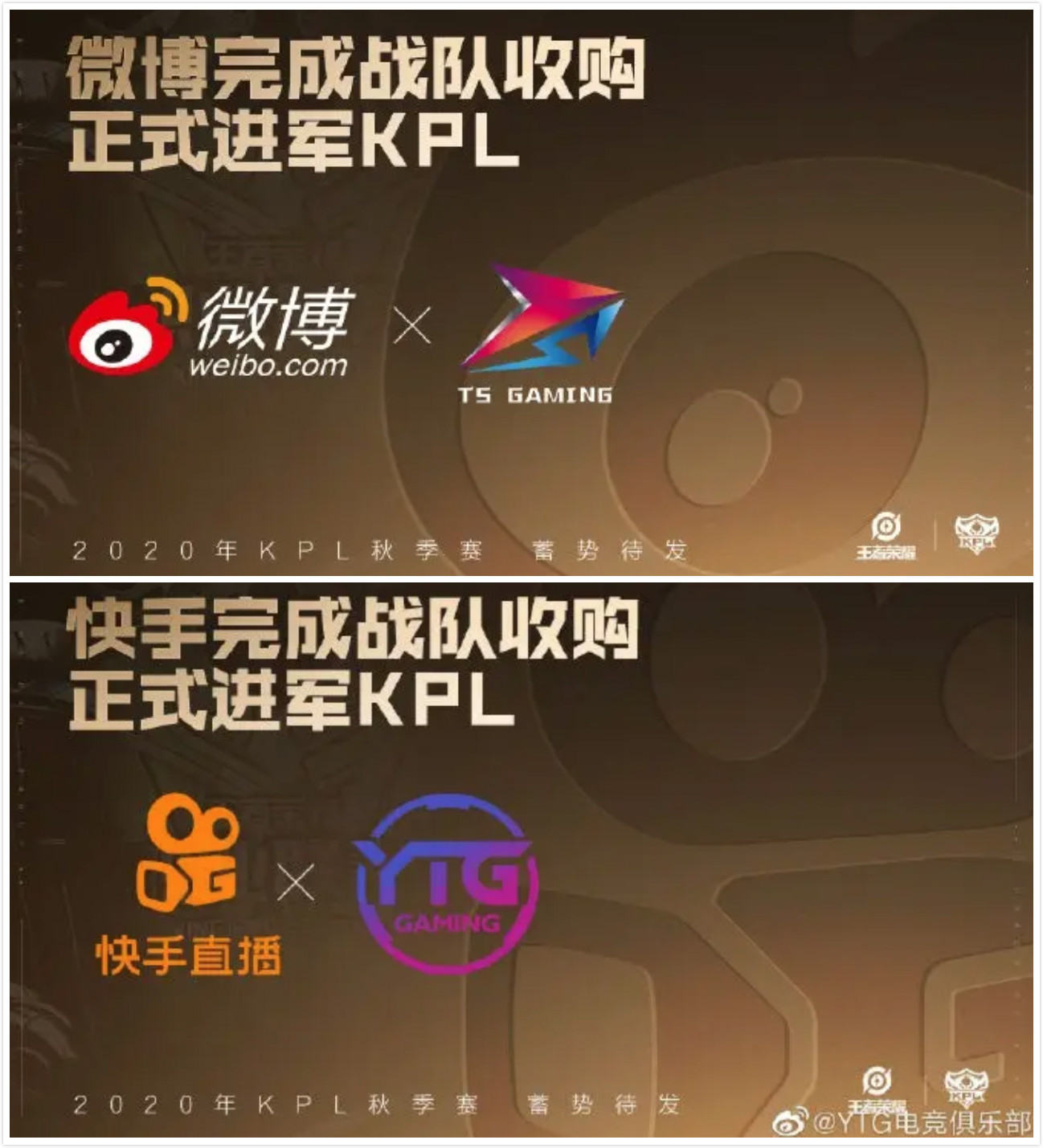 知名企业入局国内电竞赛场,尤其是LPL(英雄联盟职业联赛)和KPL(王者荣耀职业联赛)已经不是新鲜话题,前两年有京东游戏收购LPL两只战队“QG”及“NON”,去年李宁也收购了在重庆拥有主场的LPL战队Snake。而这一次,冲进KPL赛场的则是微博和快手。