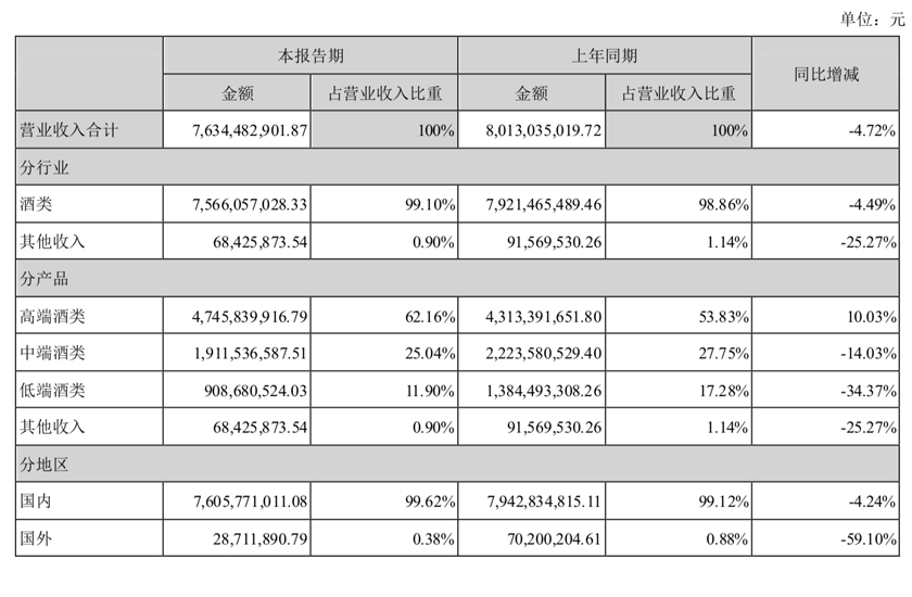 根据公告显示,今年上半年,酒类业务实现营业收入75.66亿元,占总营收的99.1%,同比降低4.49%。其中,高端酒类、中端酒类、低端酒类分别实现营业收入47.46亿元、19.12亿元、9.09亿元,分别占总营收的62.16%、25.04%、11.9%,同比增长10.03%、-14.03%、-34.37%。