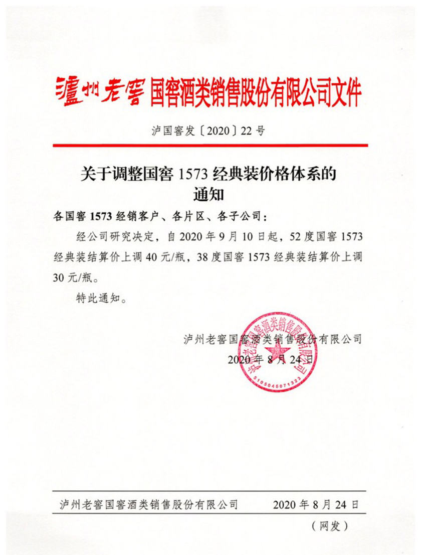 另外,界面记者梳理资料发现,6月4日,国窖1573经典装将在河南区域提价,国窖1573中原会战总指挥张彪签署了调价通知。6月24日起,国窖1573经典装在河南地区的结算价将提升10元/瓶,终端供货价调整为920元/瓶;6月5日,泸州老窖国窖酒类销售股份有限公司华北(东北)大区下发文件称,自2020年6月24日起,52度国窖1537经典装(500ml)终端结算价格将上调10元/瓶。