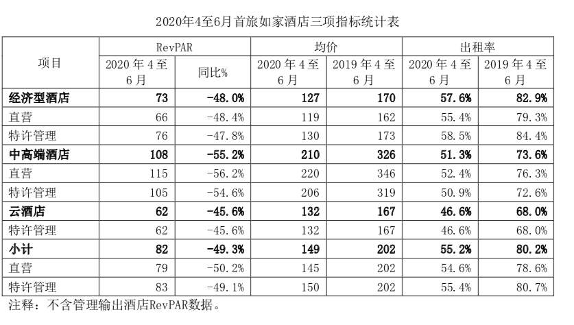 财报统计,2020年4至6月份,首旅如家经济型酒店RevPAR(每间可供出租客房收入)为73元,同比下降48%;平均出租率为57.6%,去年同期为82.9%。集团中高端酒店RevPAR平均为108元,同比下降55.2%;出租率为51.3%,去年同期为73.6%。
