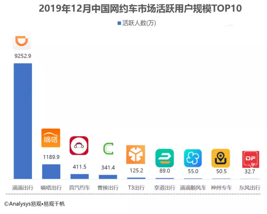 据易观数据显示,截至2019年12月,滴滴出行凭借9252.9万活跃用户规模,处于绝对的领先位置。嘀嗒出行的活跃用户达1189.9万,独立专车App中,首汽约车活跃用户规模也有411.5万。
