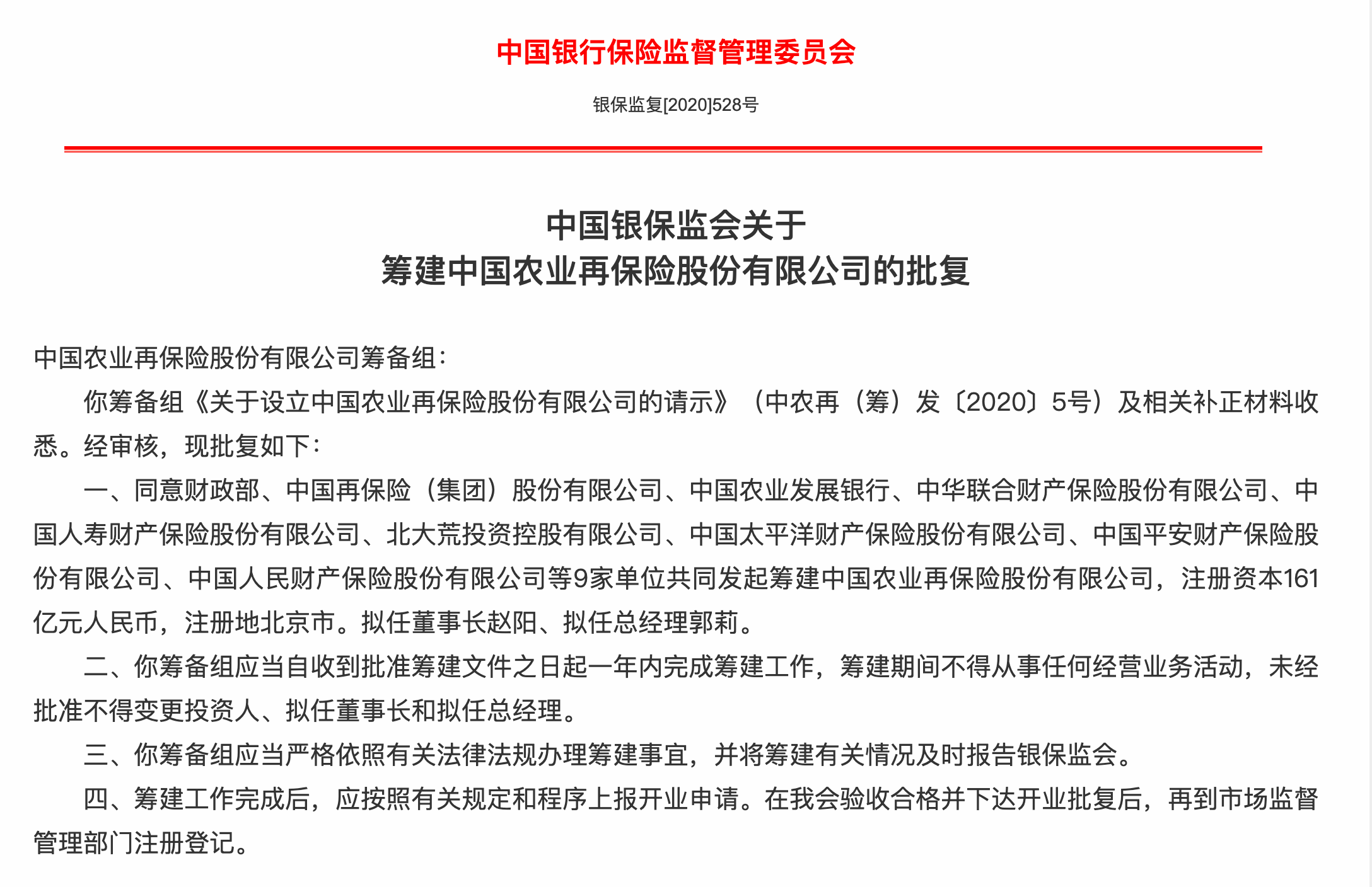 银保监会8月27日披露,批复同意中国农业再保险股份有限公司(下称“农业再保险”)筹建,注册资本161亿元,注册地北京市。