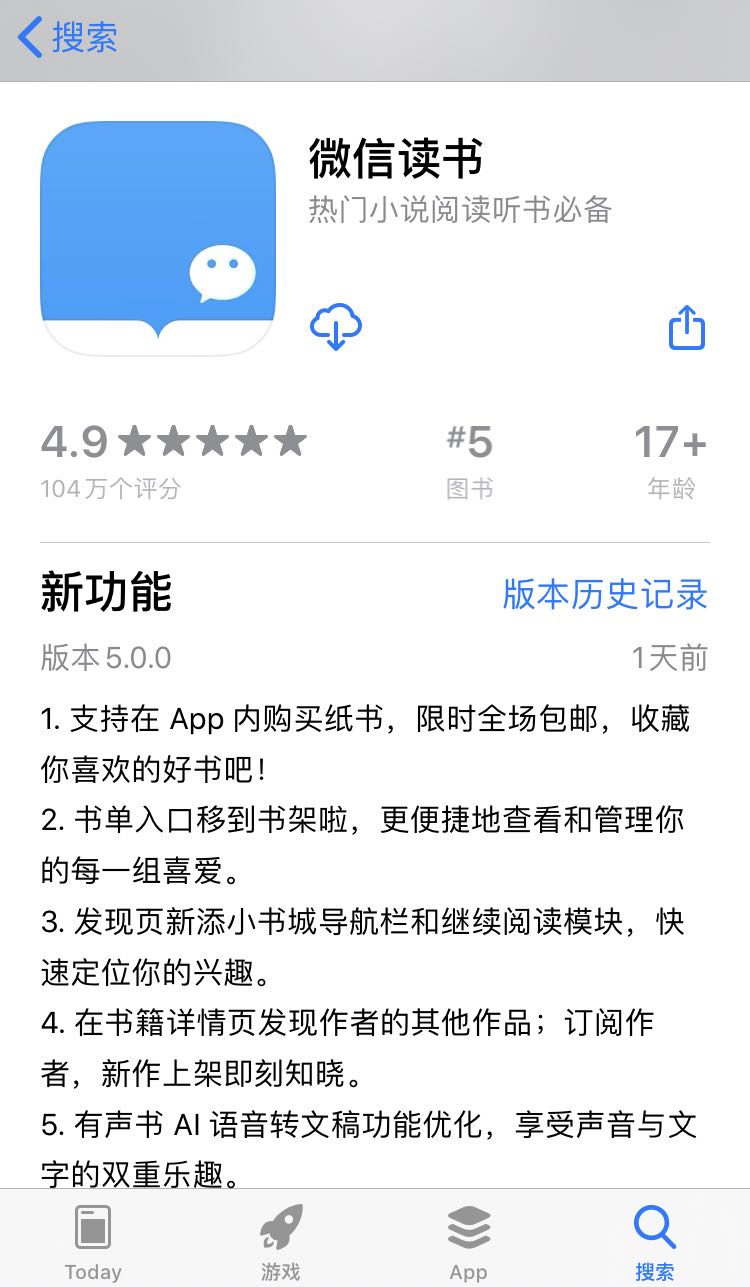 微信读书5.0.0版本上线,新增支持app内购买纸质书,有声书AI语音转文稿优化,在书籍详情页发现作者其他作品等功能。