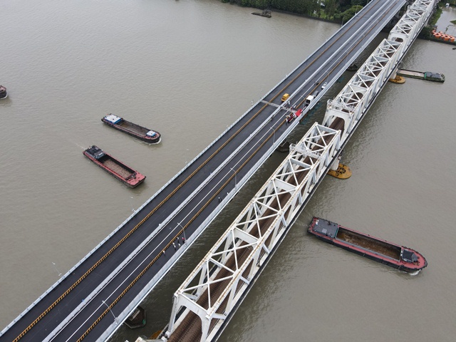 上层桥开通后,施工方还将临时封闭下层桥梁,进行下层人行道、检修桁车、景观照明等附属工程施工,为期3个月,预计今年年底前完成全部桥梁工程的施工内容。