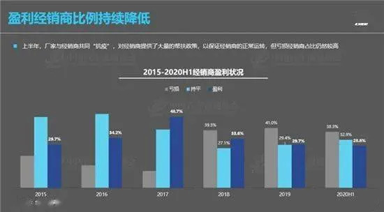显而易见,伴随着汽车销量的大幅下滑,经销商之间的价格竞争也变得白热化。在纷纷采取“以价换量”的大趋势下,经销商毛利率进一步萎缩。这也印证了《报告》中所提到的那样,在经历了2019年新车毛利率首次为负之后,今年上半年新车毛利率进一步下降至-3.5%。
