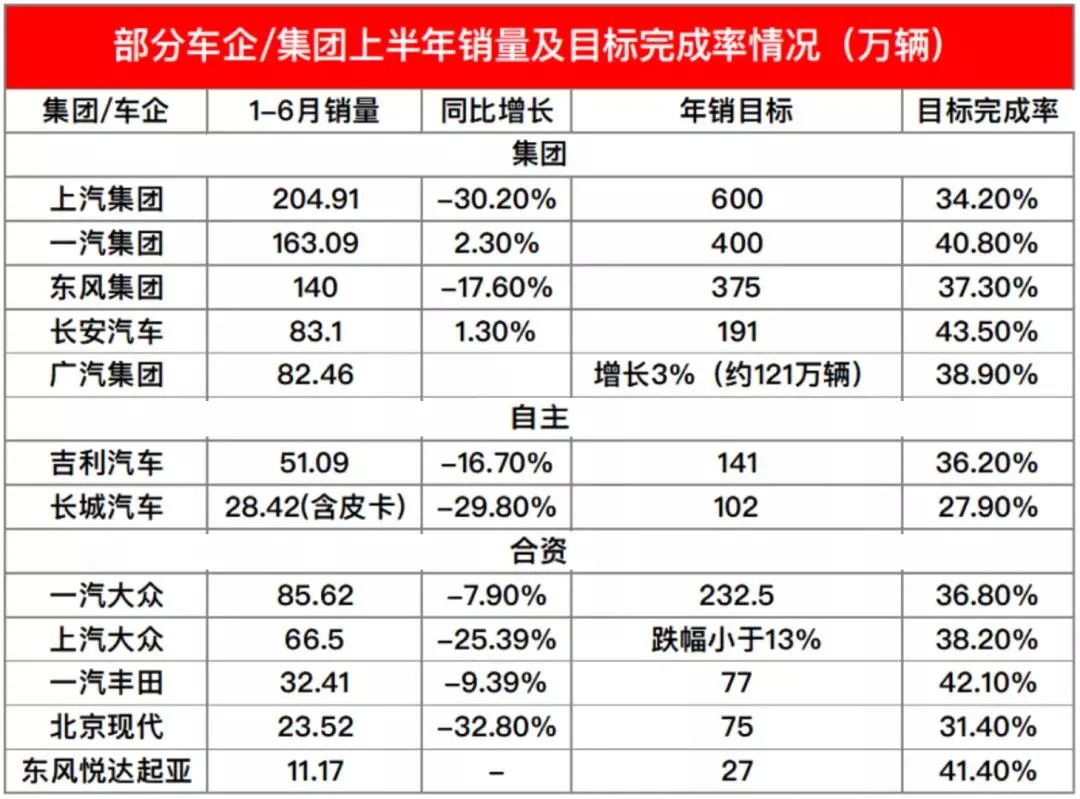截至目前,各大车企上半年销量数据均已公布。从各大车企销量目标完成率来看,要完成年销量任务仍然存在较大压力,包括此前对今年销量目标进行下调的车企。对此,中国流通协会认为,面对整体“下行”的车市大环境,车企下调销量目标的举措在情理之中。但事实上,回头看看,下调指标的品牌寥寥无几。