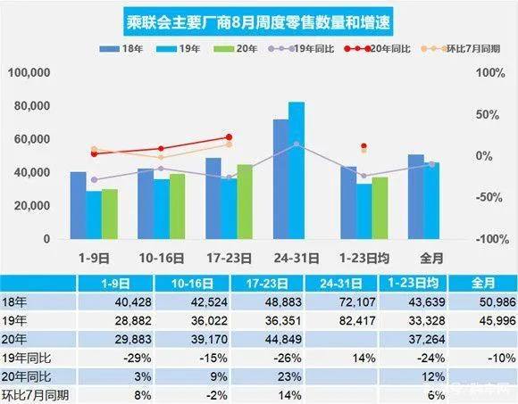 不过,以乘联会刚刚发布的8月前三周销量来看,似乎7月的增长势头仍在延续。从整个8月份前三周(1-23日)来看,乘用车日均零售销量达到37264辆,同比增长12%,环比上月同期增长6%,8月份或有望实现最近两年来最大的同比增长速度。