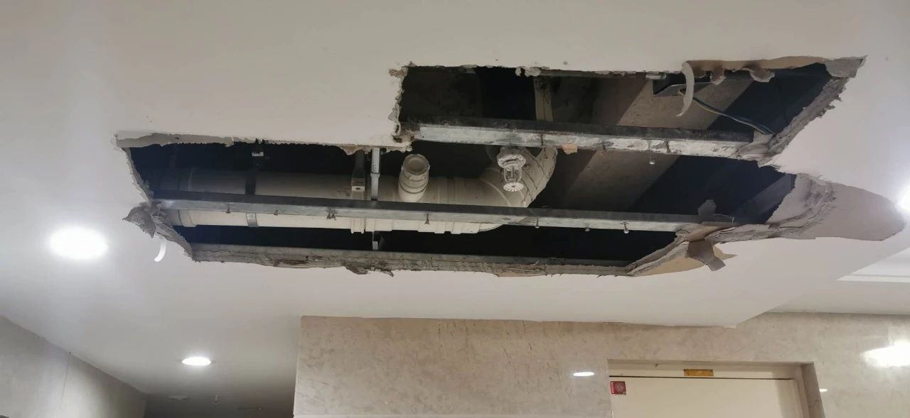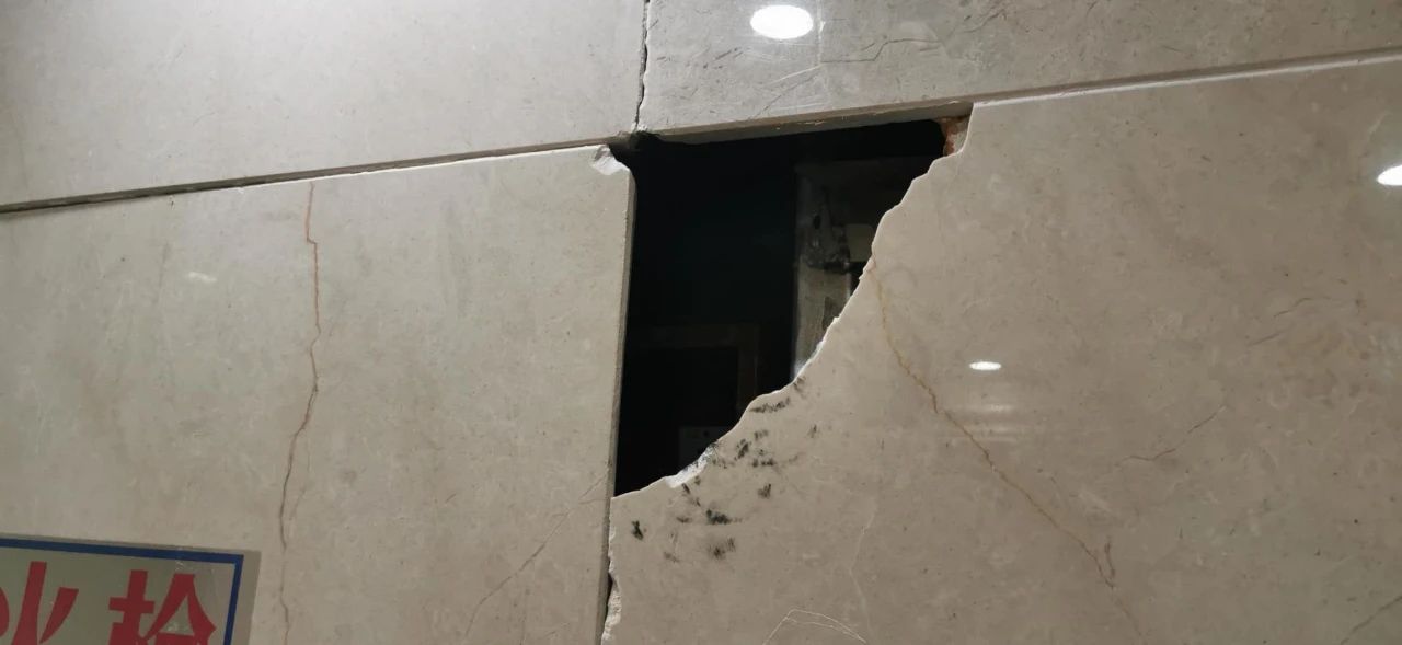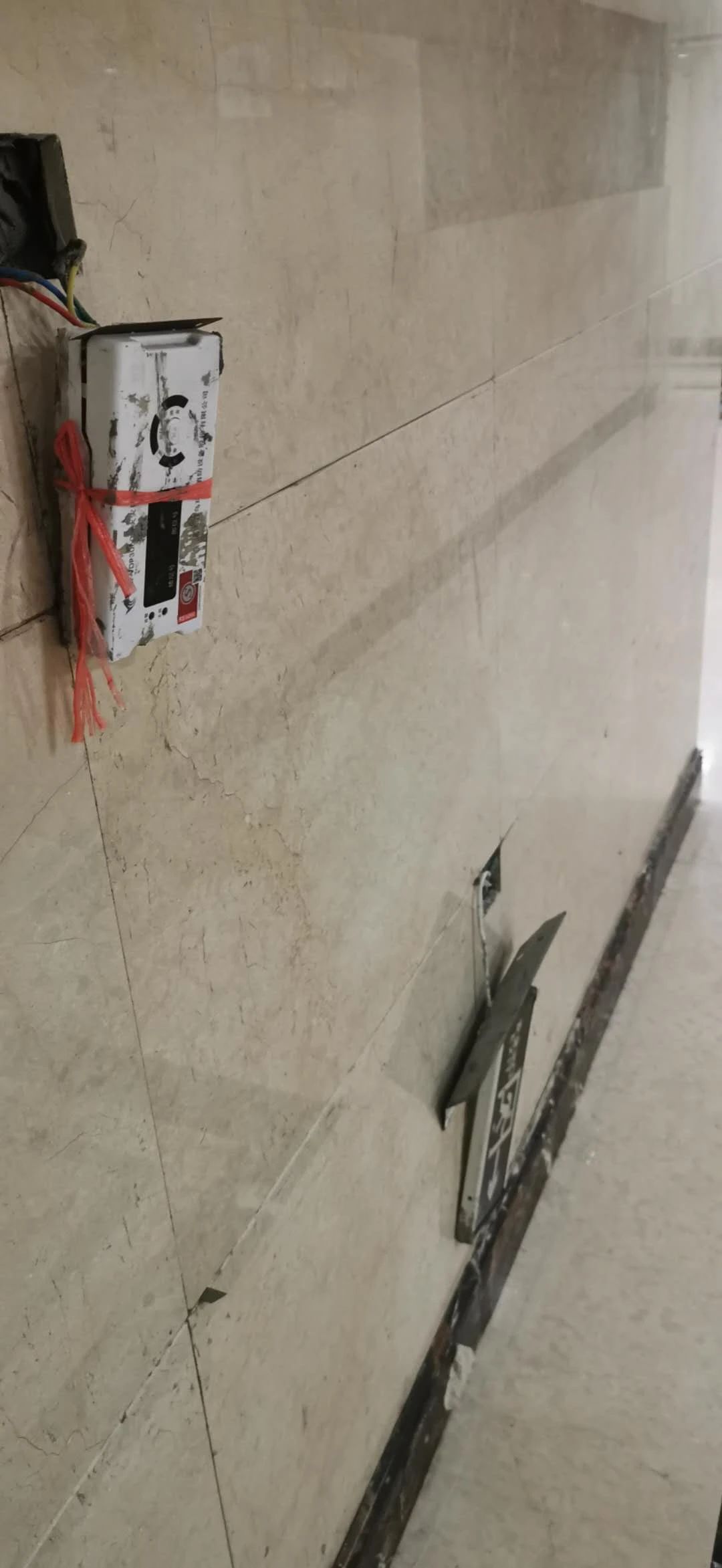 让业主糟心的,并不只是园林景观,金隅·和府质量问题也是十分突出。交房两年后,在2号楼的入户大堂,界面山东看到大片的墙砖已经脱落或者被拆下,屋顶破损露出了内侧的管道,消防设备和逃生指示灯也都脱离了原来的固定位: