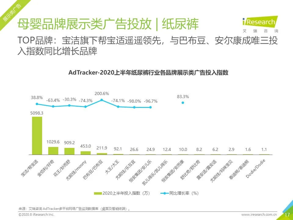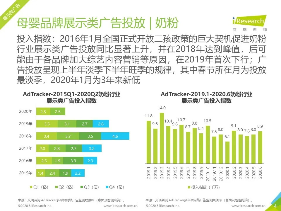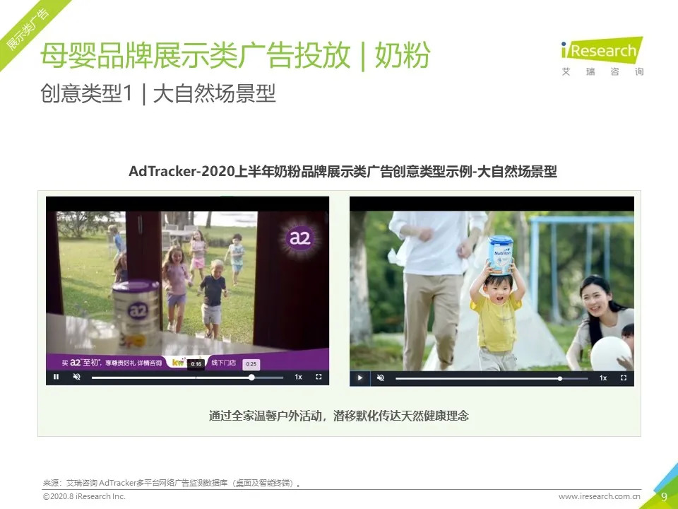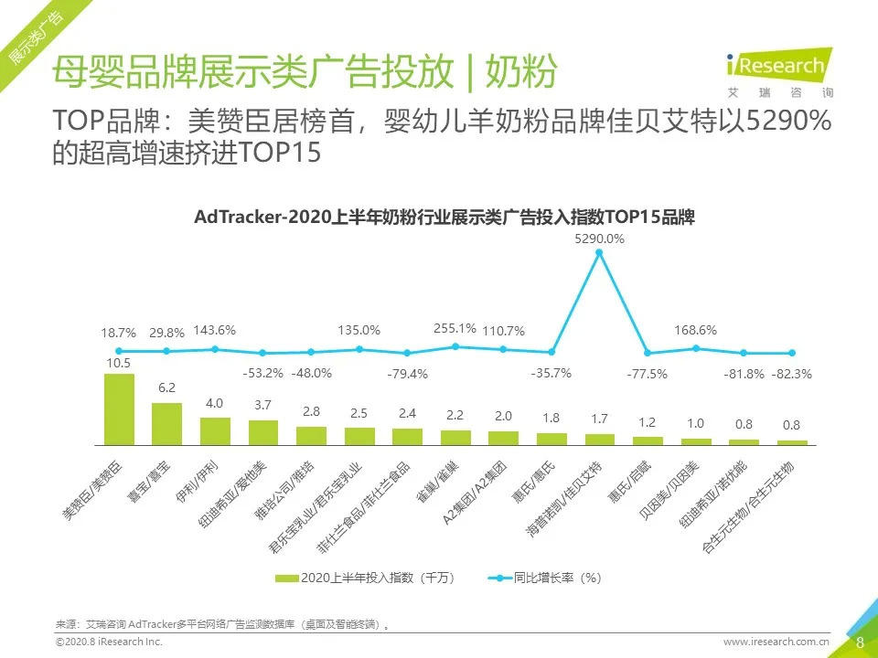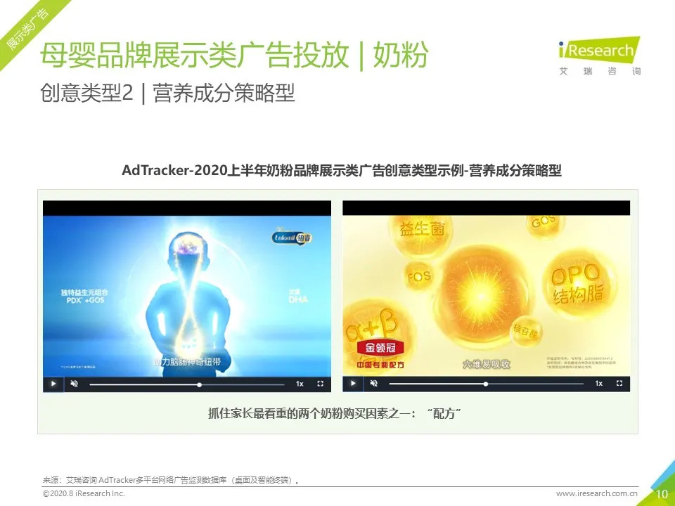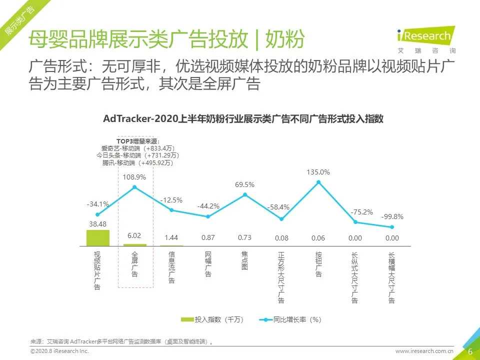 奶粉展示类广告投放呈现上半年淡季下半年旺季的规律;以“洋奶粉”品牌投放为主,国产品牌奋起直追,在2020上半年投入指数占比从去年上半年的5.3%提升至18.3%;视频+门户是2020上半年奶粉行业主投组合。