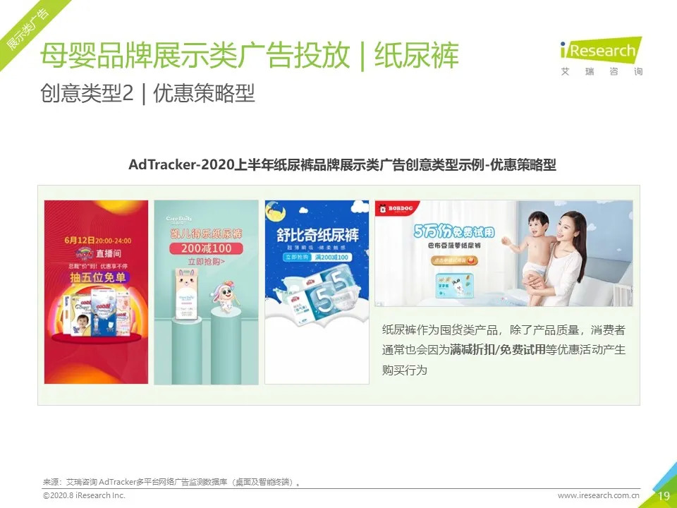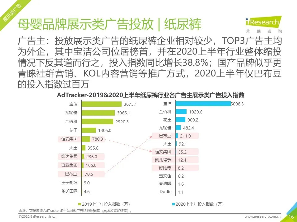 纸尿裤展示类广告投放自2018开始以Q2为投放旺季;受疫情因素影响,在2020上半年同比减少37.1%,门户+视频+亲子网站是2020上半年纸尿裤行业主投组合。