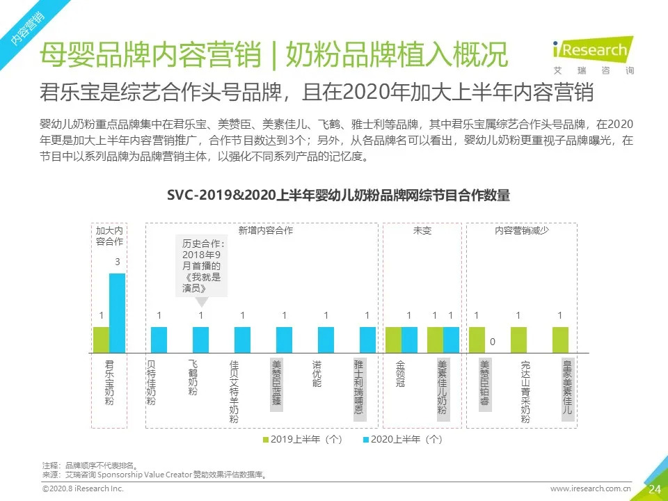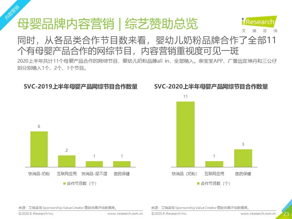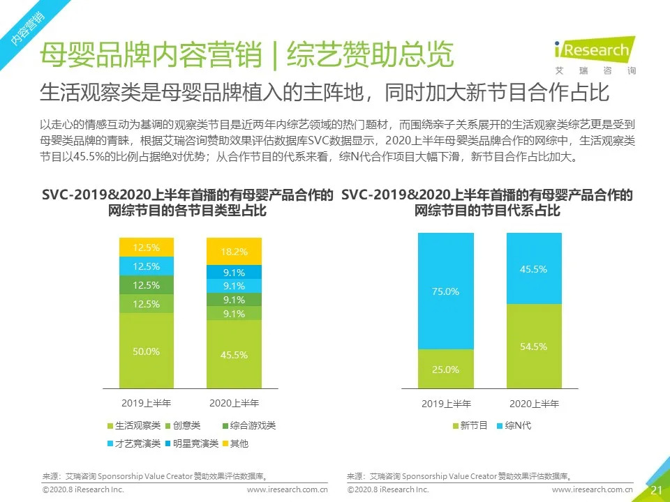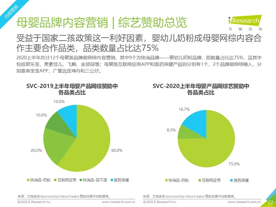 母婴产品综艺合作力度逐年增加,生活观察类是母婴品牌植入的主阵地;婴幼儿奶粉成母婴网综内容合作主要合作品类,品类数量占比达75%。
