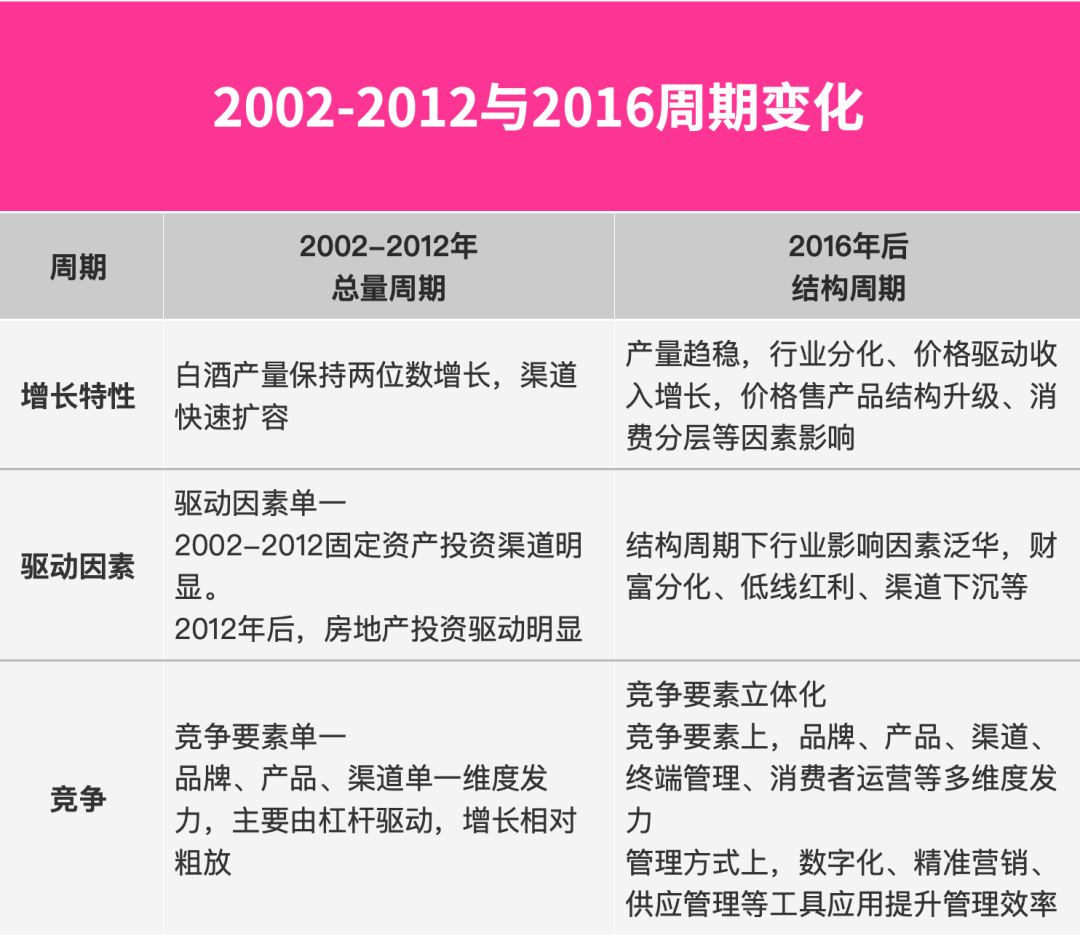 在千禧年后,白酒总量下降的同时两极分化,白酒企业开始对品牌、渠道产生了更多思与实践,白酒行业由产能驱动逐步迈向渠道驱动,同时为后续品牌驱动奠定基础。