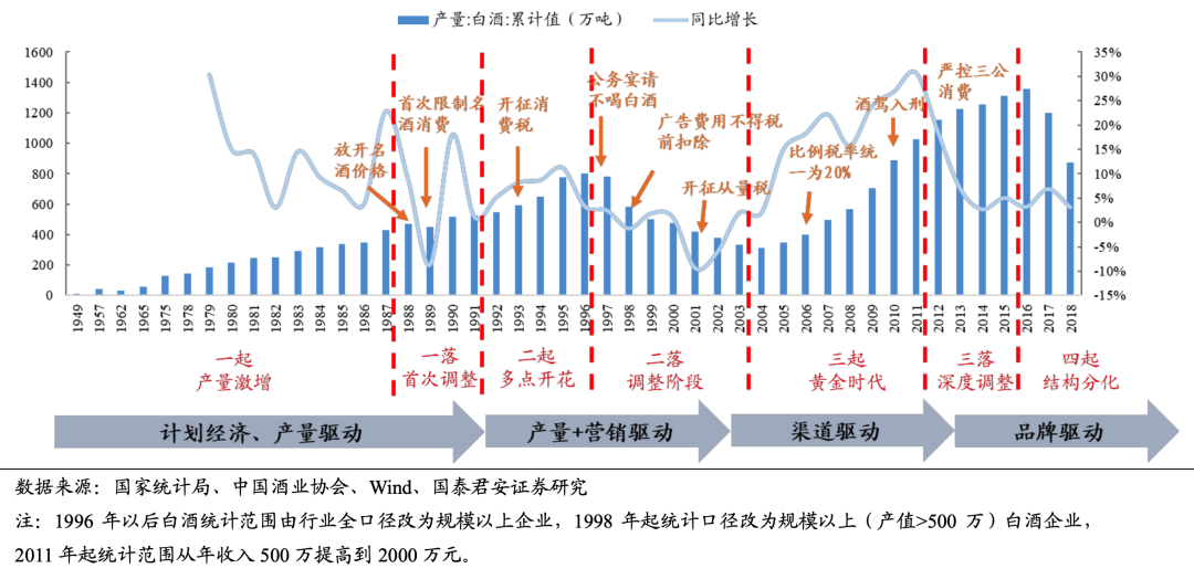白酒行业历史上经历了四起三落,行业从产量驱动转向产量+营销驱动、渠道驱动,最终进入品牌驱动,行业龙头多次易主,由泸州老窖到山西汾酒,再到五粮液,最终变成如今的贵州茅台坐稳头号交椅。
