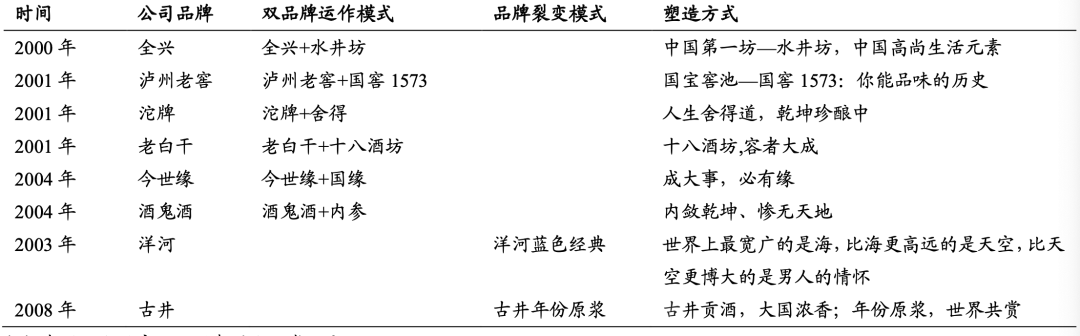 开始采用双品牌战略,创立中高端大单品提升品牌形象,抢占政商核心消费群体领袖的心智,如全兴创立水井坊、泸州老窖创立国窖1573、洋河打造蓝色经典产品线、沱牌创立舍得、老白干创立十八酒坊、今世缘创立国缘等。