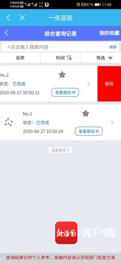 点击界面右下角【查询】按钮,选择“定点”或“范围”模式确定查询范围后。点击“列表”功能查看并管理相关地块报告书。