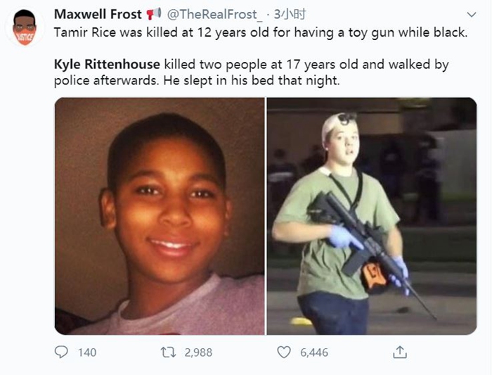 网友也在Twitter发文谴责,2014年,12岁黑人男童赖斯(Tamir Rice)因为手拿一把玩具枪被警方开枪打死。而17岁的里滕豪斯杀死了两人、与警察擦肩而过,还平平安安在自己家睡了一觉。