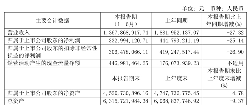 8月28日,安徽迎驾贡酒股份有限公司(以下简称“迎驾贡酒”)(603198)发布《2020年半年度报告》显示,今年上半年,公司实现营业收入13.68亿元,同比降低27.32%;归属于上市公司股东的净利润为3.33亿元,同比降低25.14%;经营活动产生的现金流量净额为-4.47亿元。