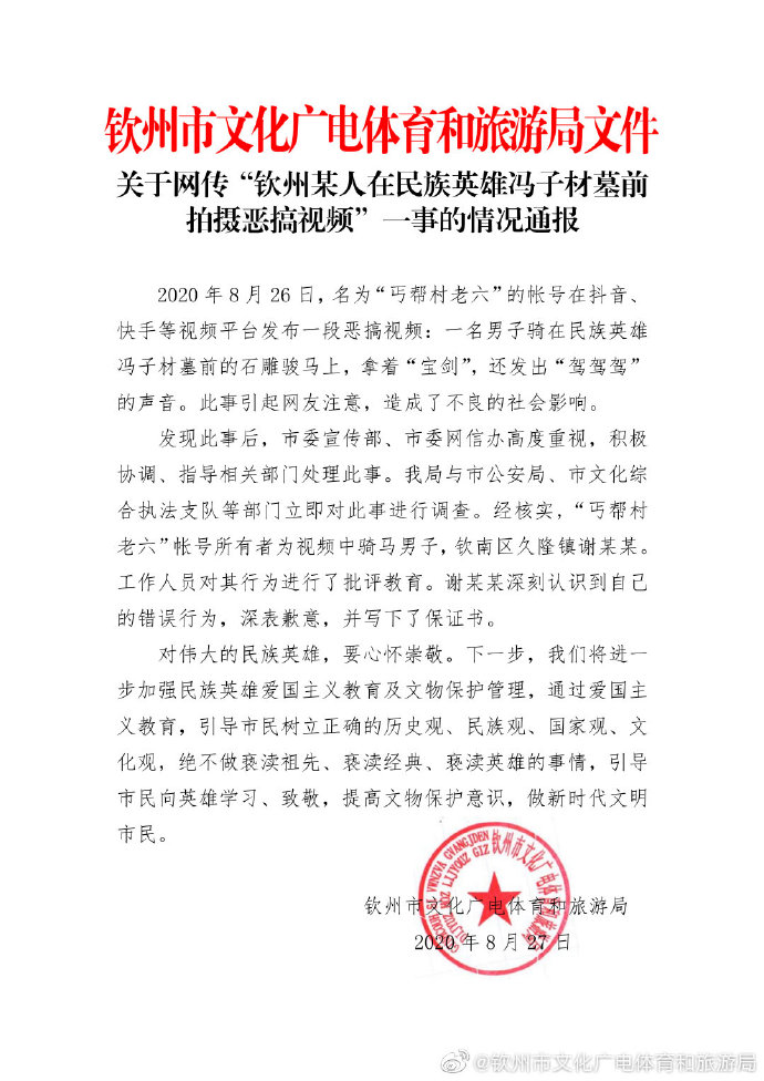 据广西钦州市文化广电体育和旅游局官方微博消息,8月26日,名为“丐帮村老六”的帐号在抖音快手等视频平台发布一段恶搞视频:一名男子骑在民族英雄冯子材墓前的石雕骏马上,拿着“宝剑”,还发出“驾驾驾”的声音。此事引起网友注意,造成了不良的社会影响。市委宣传部、市委网信办高度重视,积极协调、指导相关部门处理此事。经核实,“丐帮村老六”帐号所有者为视频中骑马男子,钦南区久隆镇谢某某。工作人员对其行为进行了批评教育。谢某某深刻认识到自己的错误行为,深表歉意,并写下了保证书。