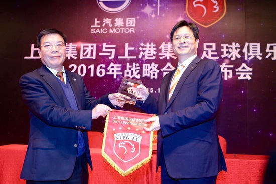 北京时间12月28日下午,上海上港俱乐部与上汽集团召开媒体见面会。双方表示,“上汽将与上港俱乐部进行品牌合作,合作期目前仅限2016年。”在发布会上,作为球员代表出席的武磊和孔卡,均穿上了胸前广告为“上汽集团”的新赛季主场球衣。待到2016赛季进行中,上海上港的球衣胸前,还有可能出现“上汽荣威、上汽名爵”的字样。此前有消息称,上汽集团为此支付的费用,大约在1.5亿元左右。对此,上汽集团并没有给予官方回应,双方在发布会上也没有透露具体的赞助金额。
