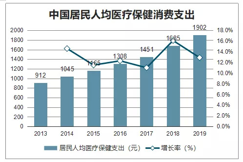 我国居民人均医疗保健支出同比增长12.9%,2013-2019年复合增长率13%,高于同期人均可支配收入增速;